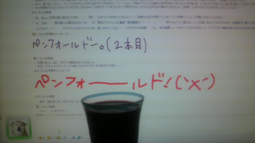 あと、何処にも売って無いペンフォールド(白)を探そうとしてたのに、違うお酒を勧められていくつか試飲した後、梅酒購入。っていうかウチの近所は白を入荷してない模様orz<敵の血に染まったペンギンしか居ないなんて!!(殲滅戦後のペンギンみたいなイメージ)